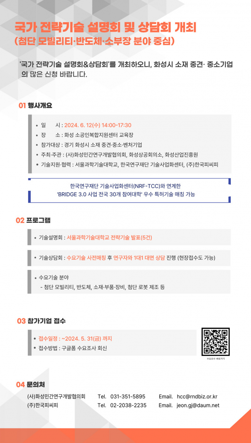 관내 중견·중소기업의 기술 경쟁력 강화를 통한 강소 첨단기업 육성 및 지역경제 활성화를 위한 국가 전략기술 분야 수요기술을 발굴하기 위해 아래와 같이 수요조사를 실시하고자 합니다. 제출방법은 수요조사서 작성 후 이메일 제출 또는 구글폼 설문 https://forms.gle/qzcTMub3vts4k6Zk6 작성이오니 편하신 방법으로 참여 부탁드립니다. <국가전략기술 기반 R&D/사업화를 위한 수요조사> 1. 대상 : 화성시 소재 중견·중소기업 2. 제출방법 (택 1) ㅇ (방법1) 이메일 제출 (hcc@rndbiz.or.kr) - 기술 수요조사서(양식 첨부) ㅇ (방법2) 구글폼 설문지 제출 - https://forms.gle/bz919a5qorCtDRqM8 3. 제출기한 : 2024. 5. 10 ~ 5. 31 (3주) 4. 문의 : 화성민간연구개발협의회 사무국 (031-351-5895) 감사합니다. |