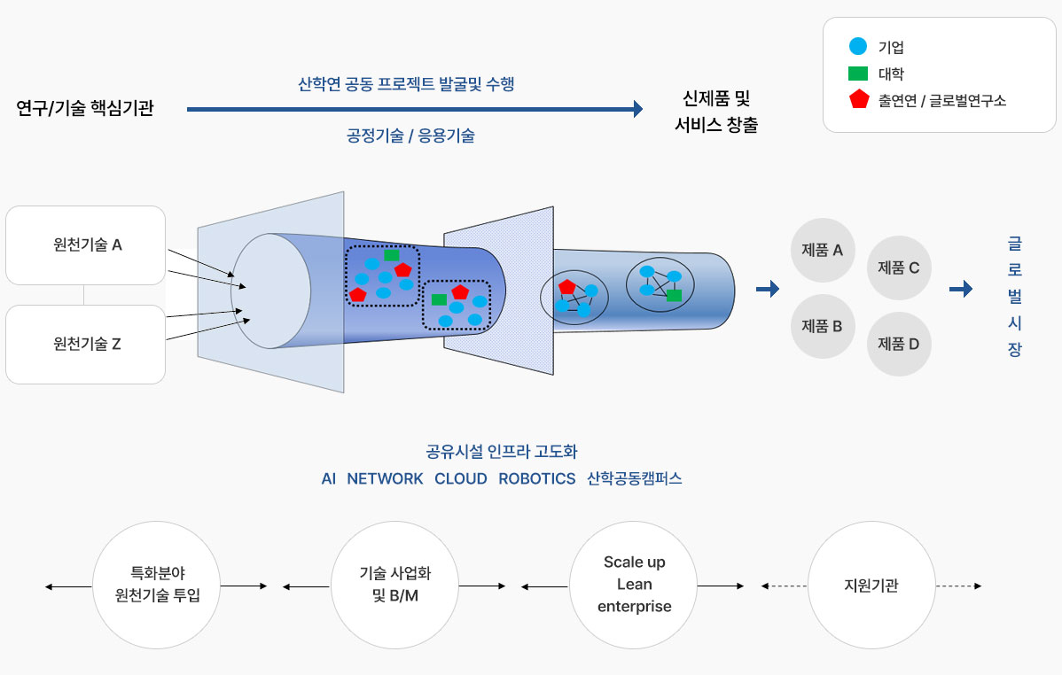· 민/관연구소 대학 등의 원천 기술을 활용한 비즈니스 모델을 발굴하고,기업의 공정혁신과 응용기술을 통해 신제품과 서비스를 창출하고 디지털 대전환으로 기업과 고객/시장이 실시간 상호작용하여 지속적인 경쟁우위 확보로 글로벌시장 확대.