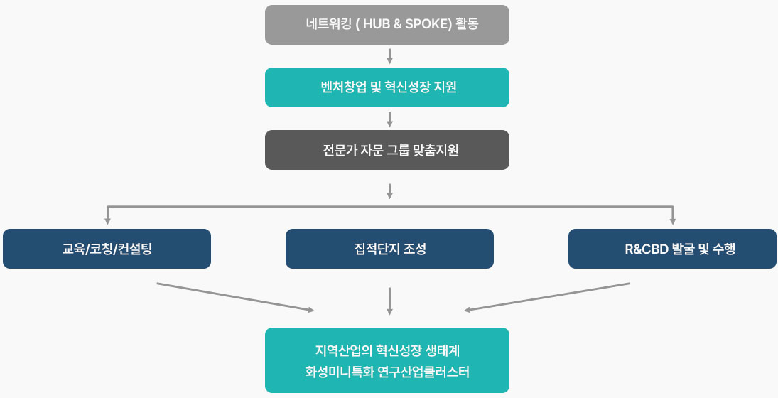· 연구/기술개발과 산업별 특화분야를 지역중심으로 융복합을 통해 혁신 성장을 위한 산학연관 네트워크 협의체를 구성하여 운영함으로써 지역경제 발전 과 동반성장 공헌.